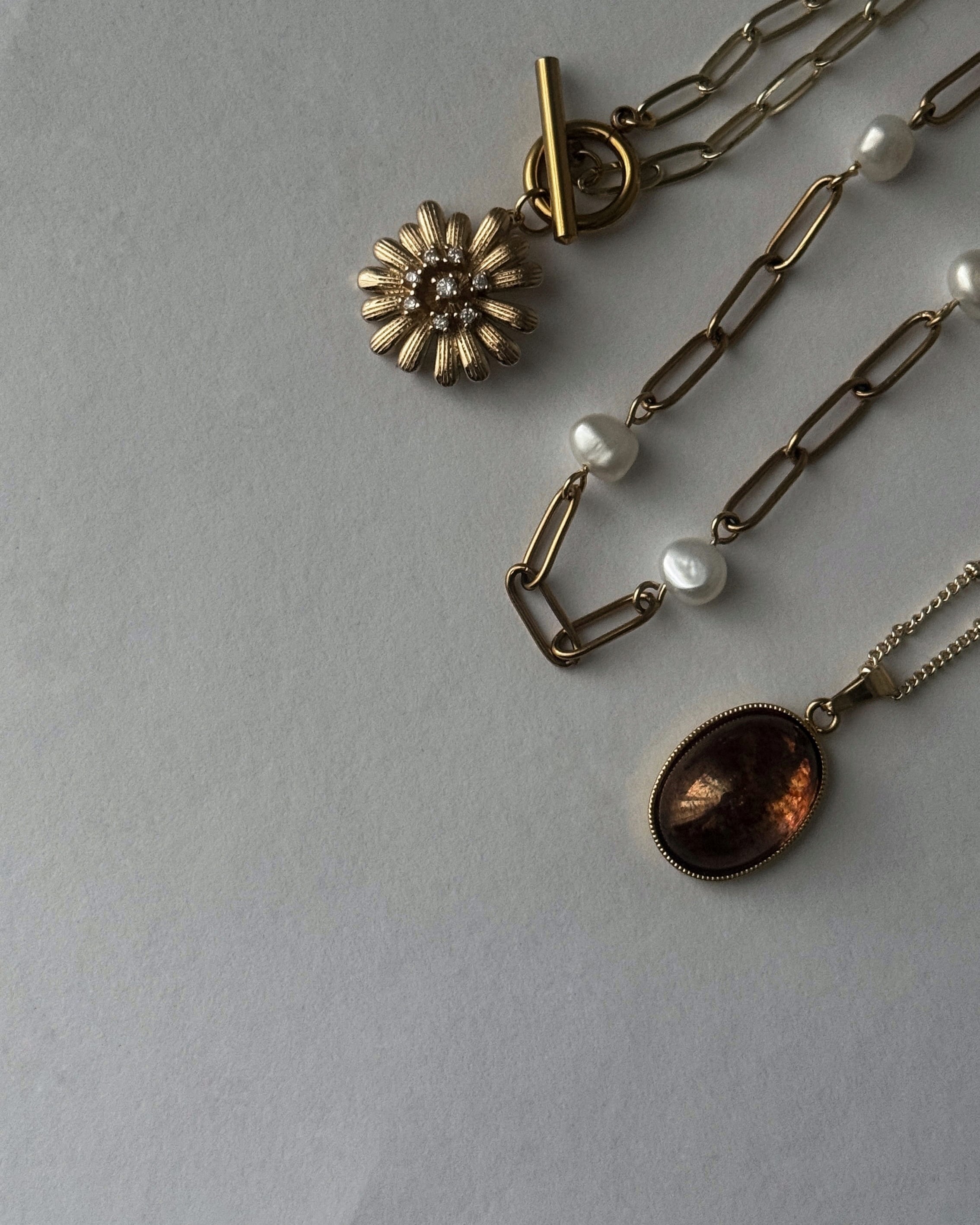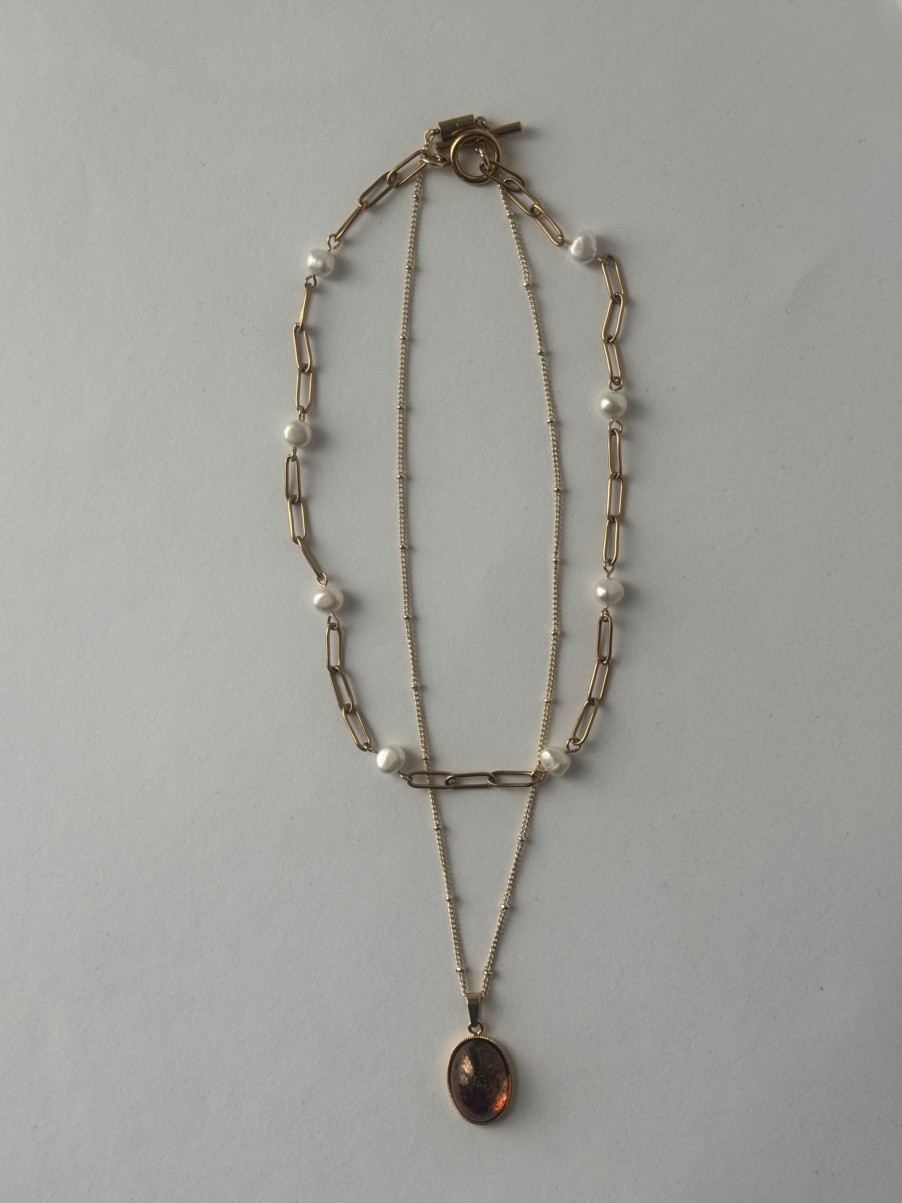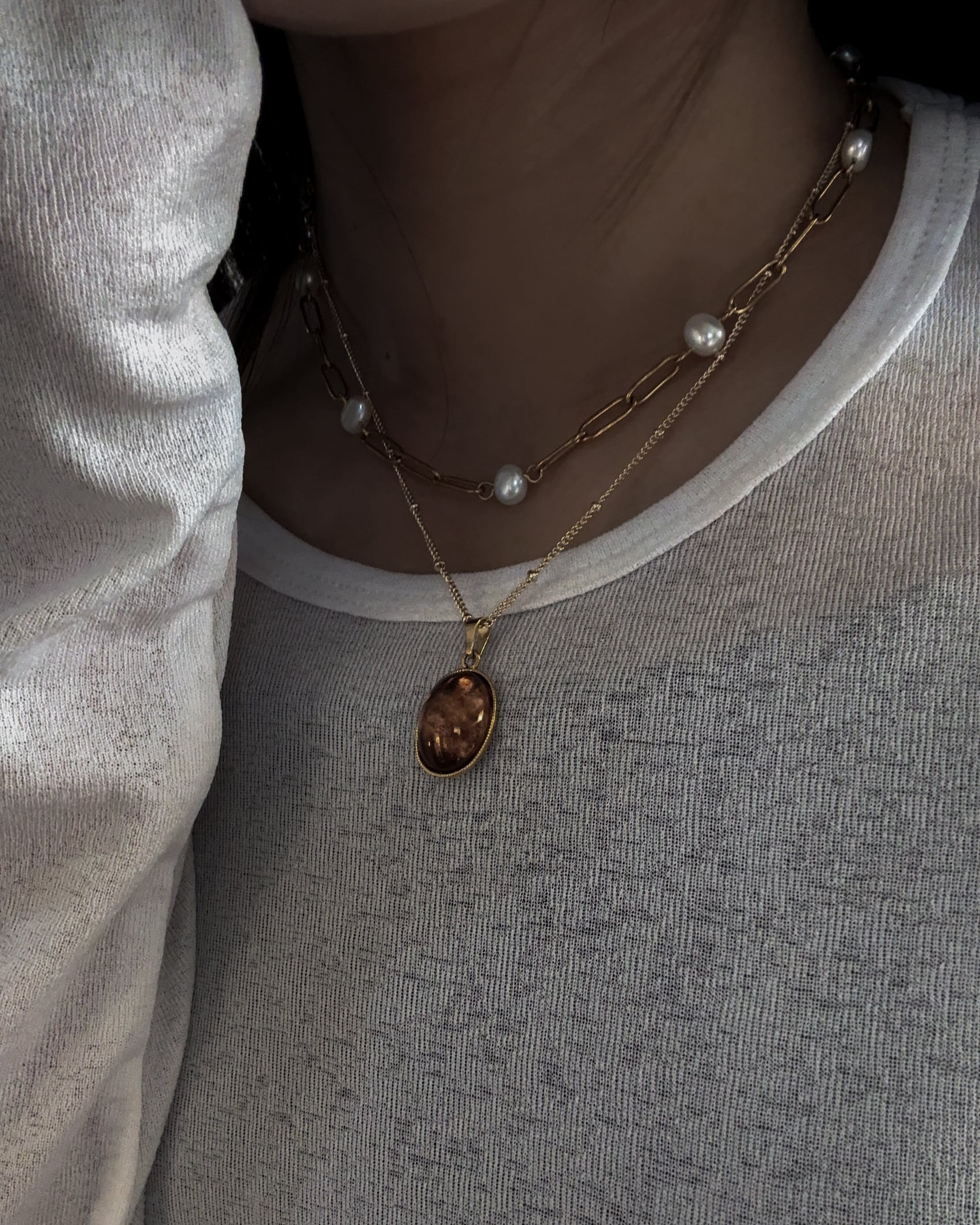 光の角度で色が揺れる、チェコラスターカボションのネックレス。