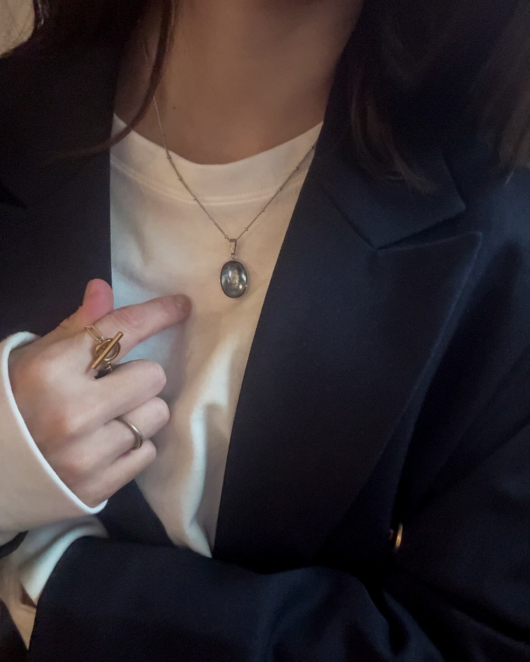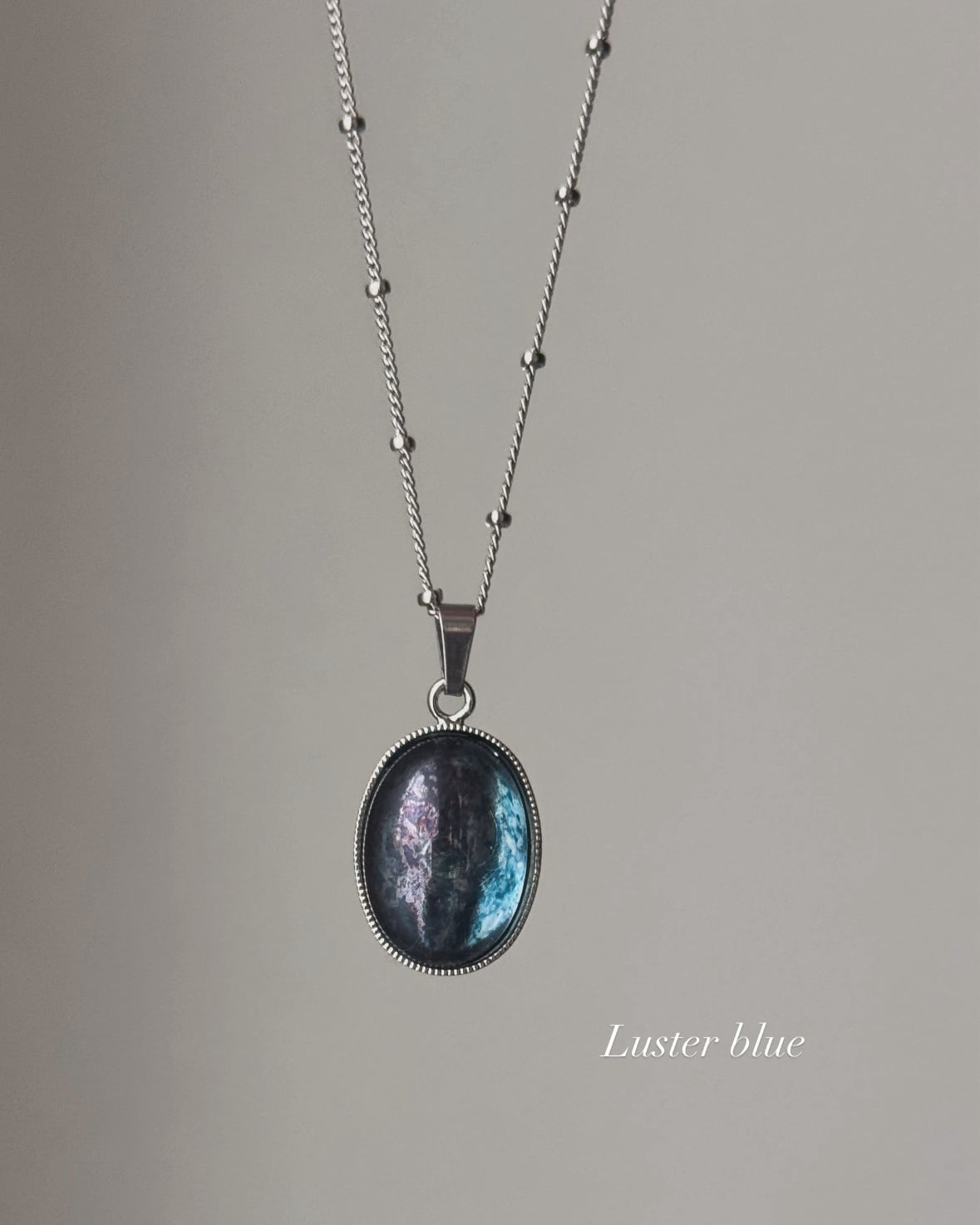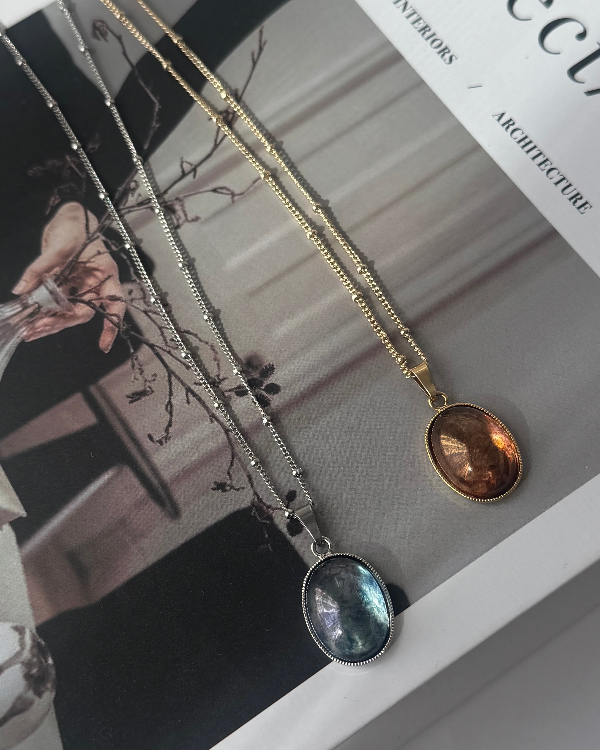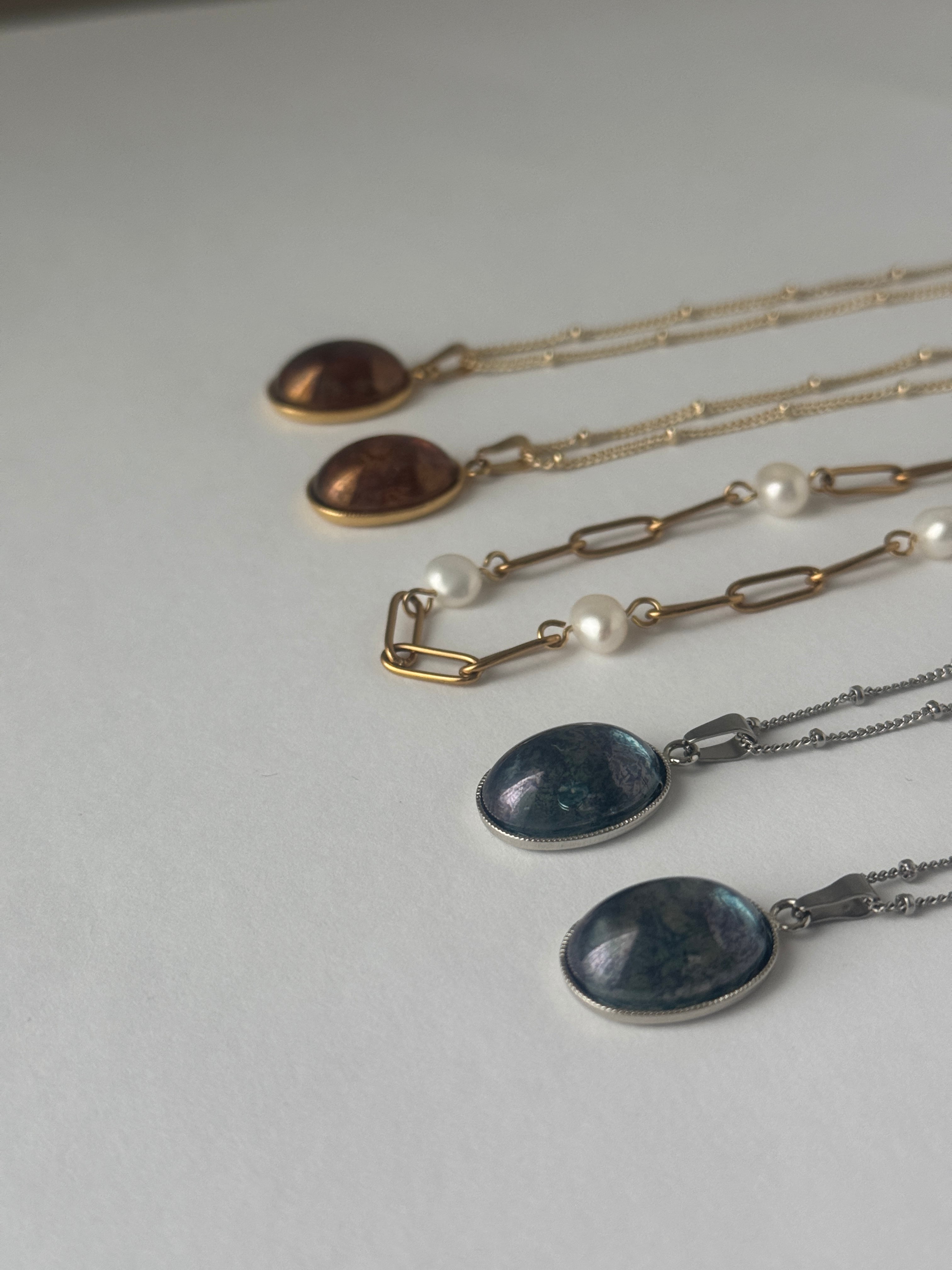 光の角度で色が揺れる、チェコラスターカボションのネックレス。