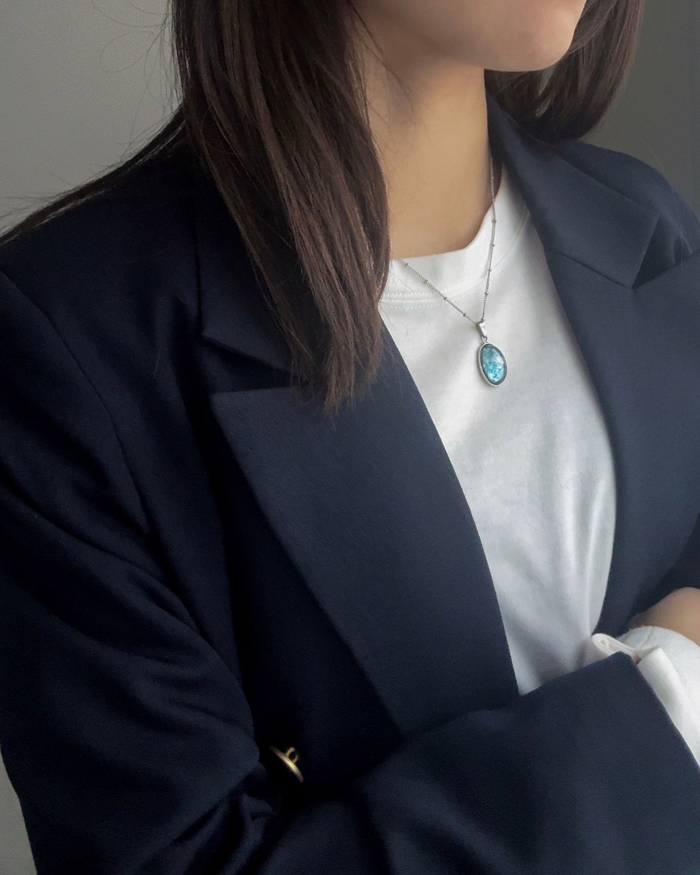 透明感のあるブルーが、胸元に凛とした印象を添えます。