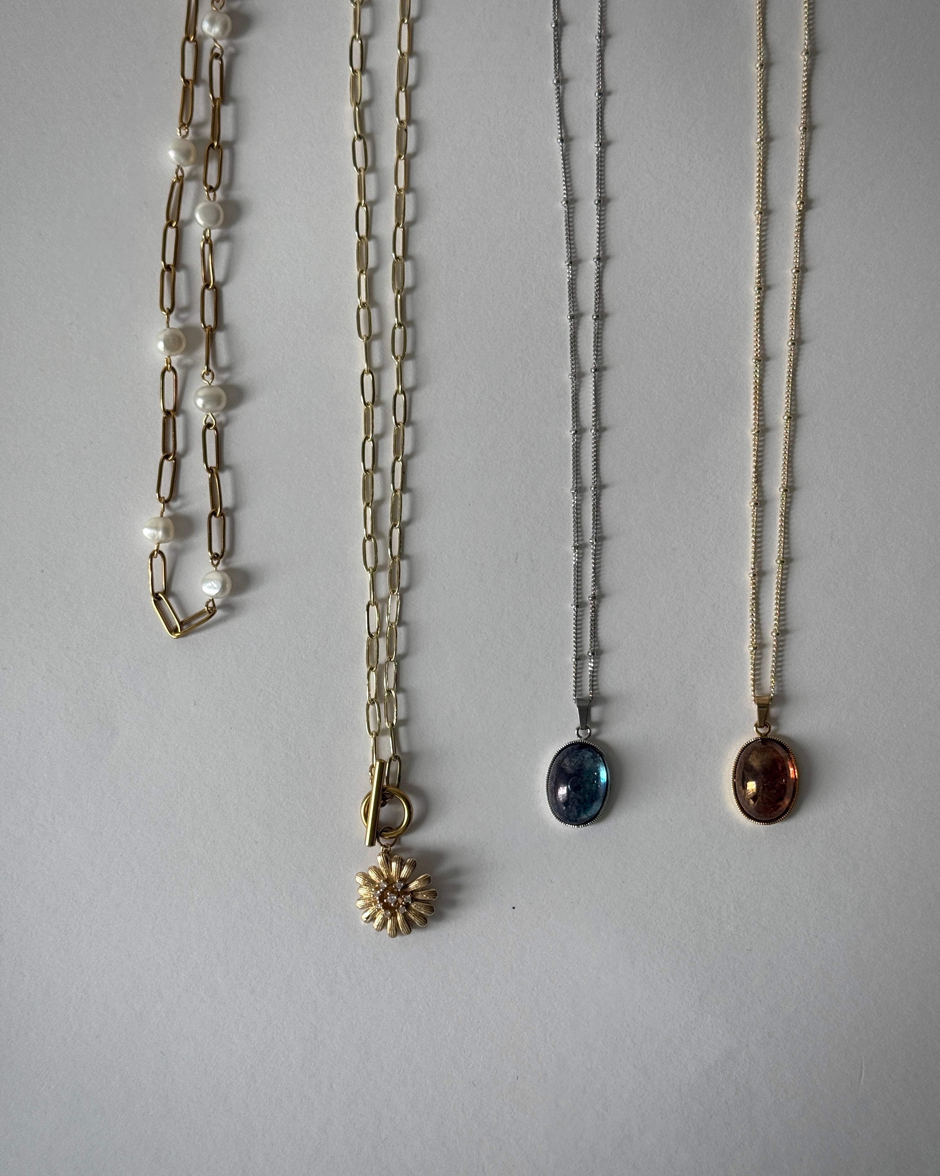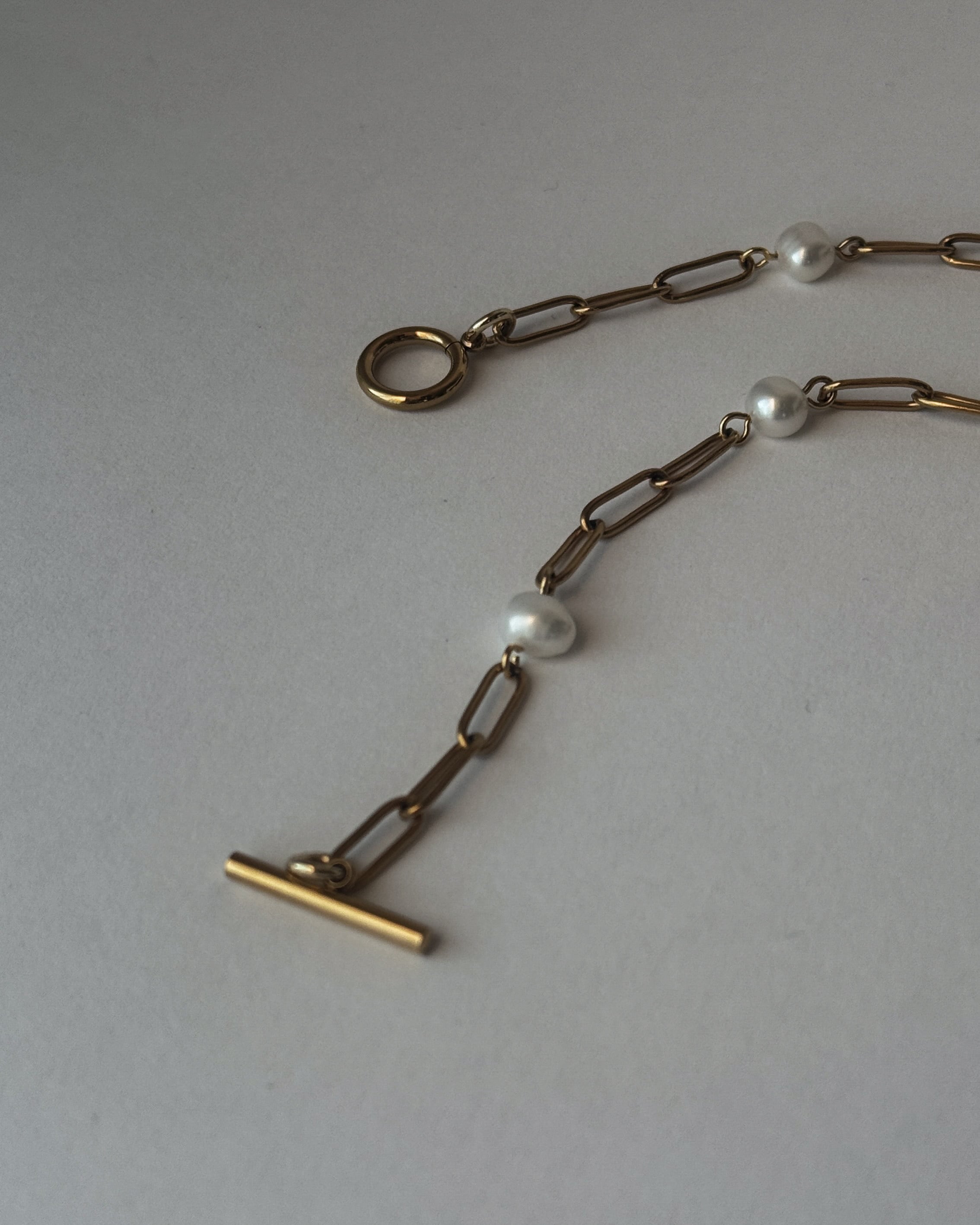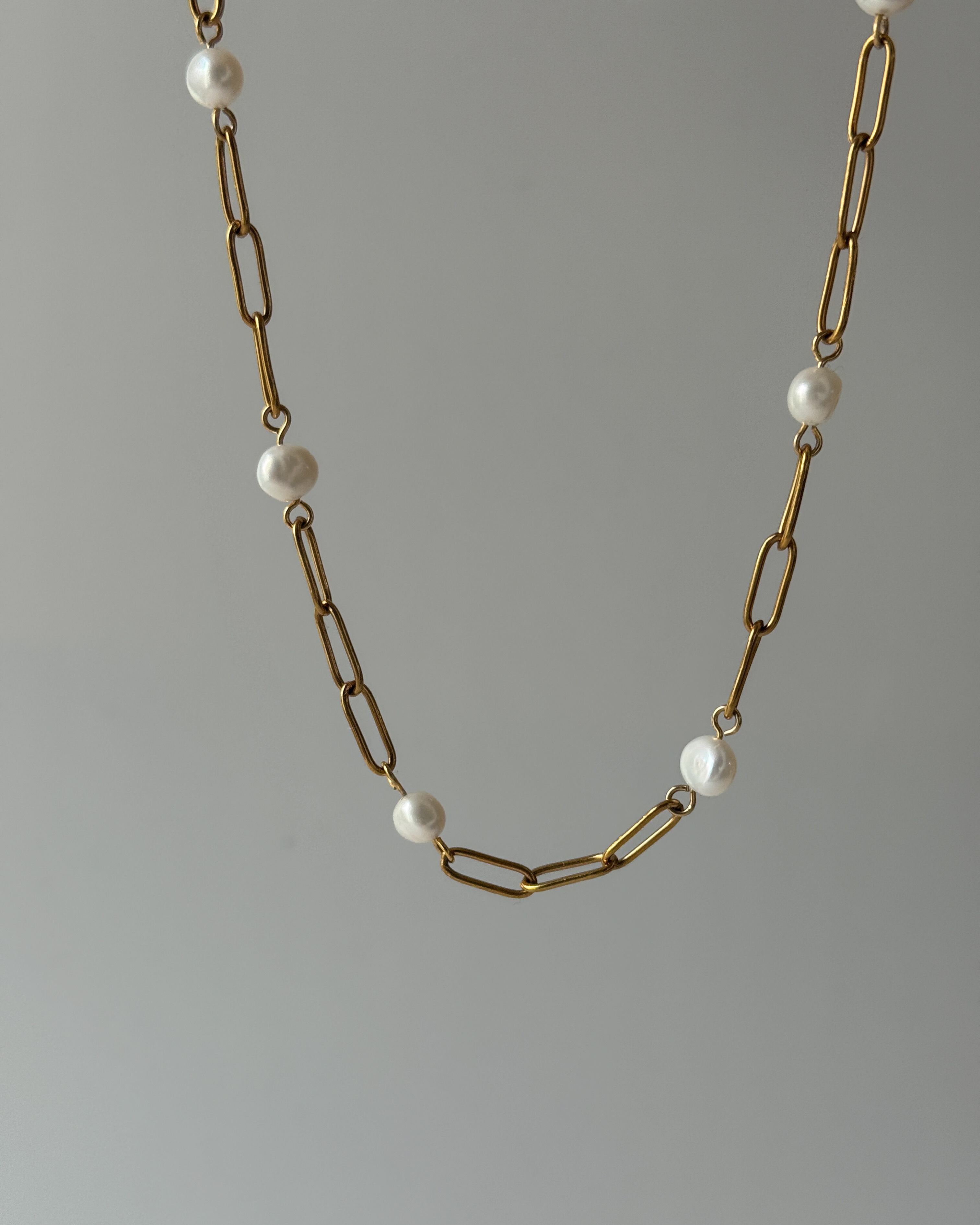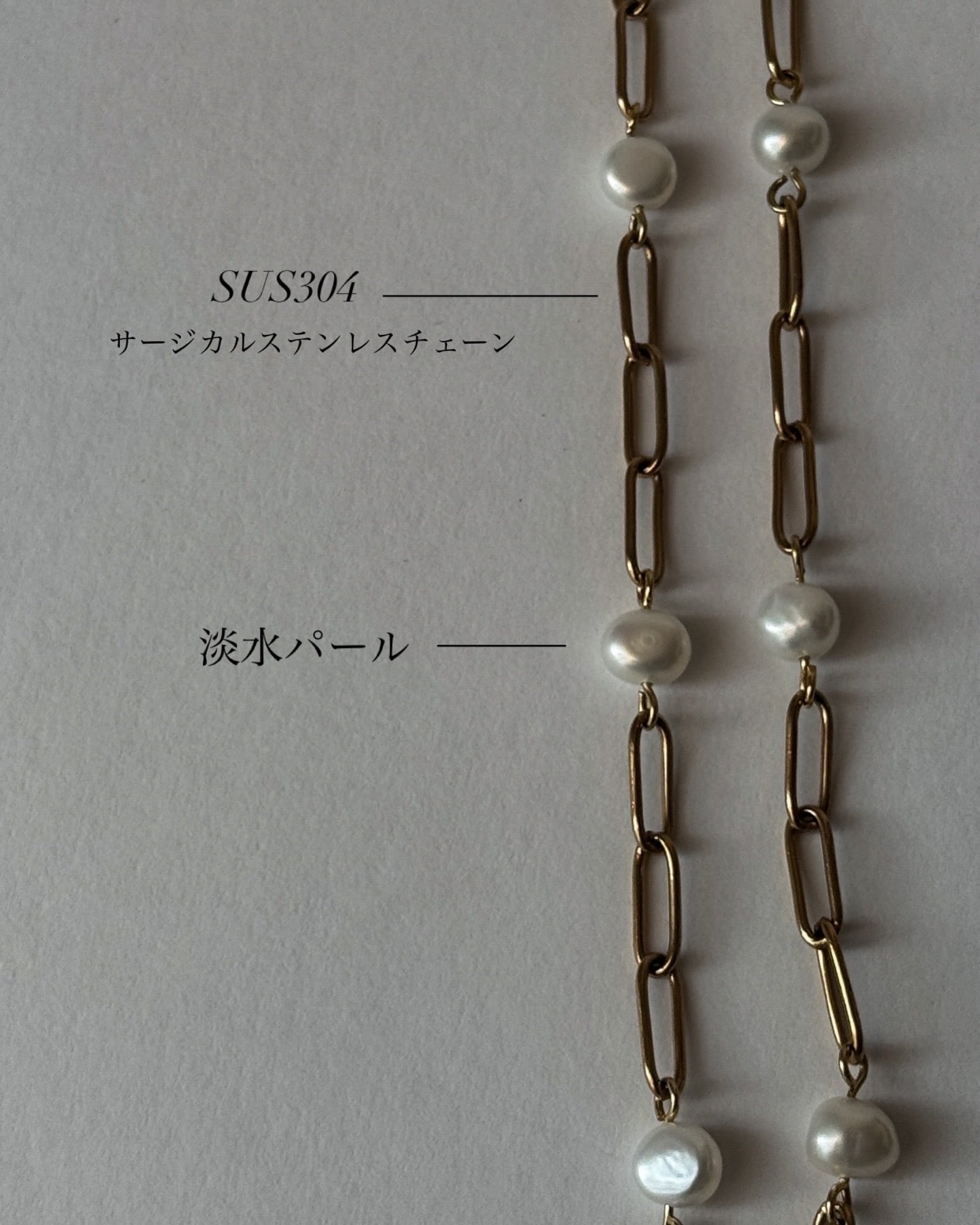 淡水パールとチェーンのコントラストが、首元の空気を静かに引き締めるネックレス。