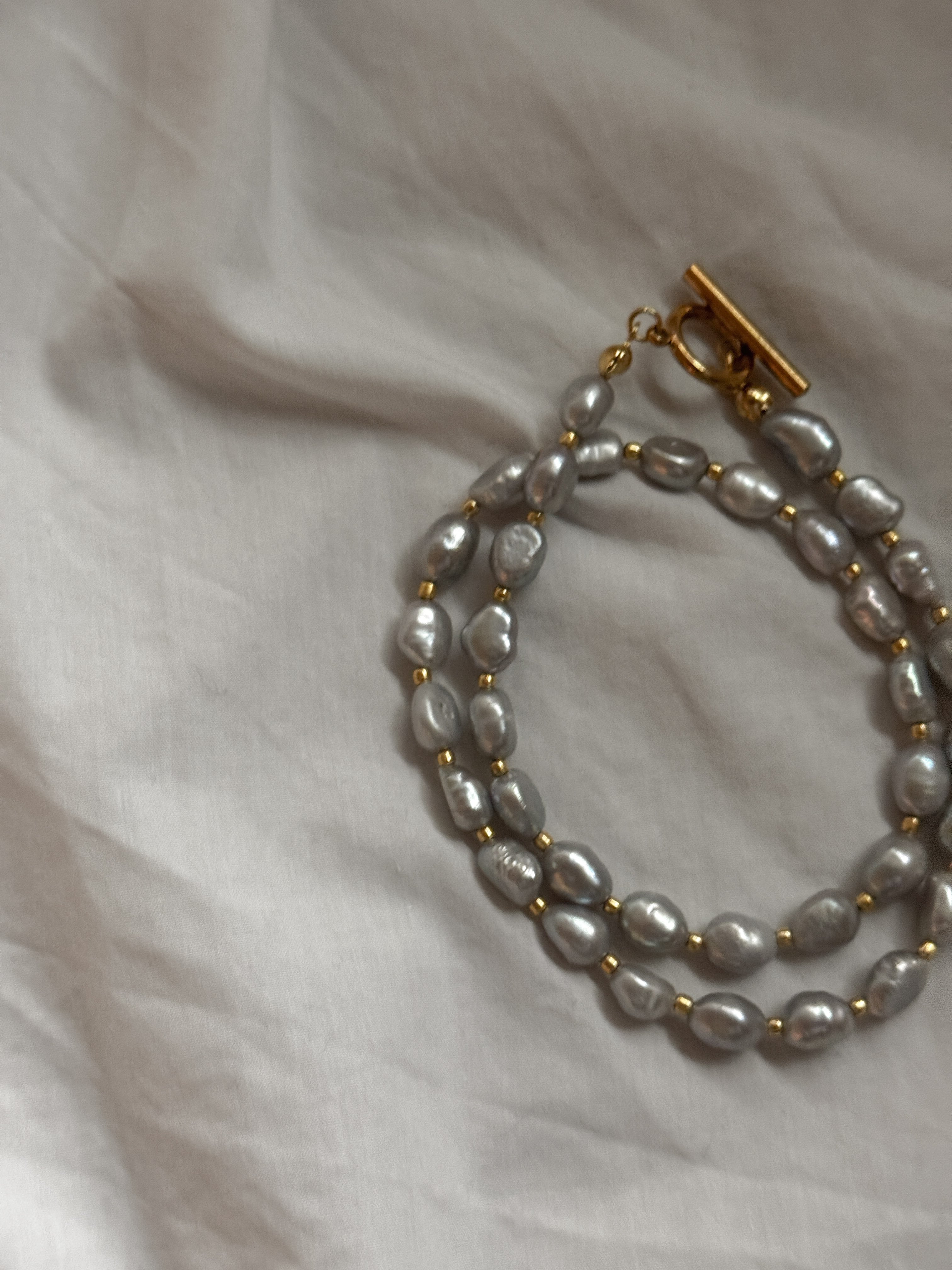 そんな柔らかな艶のグレーパールと 24Kビーズを贅沢に繋いだ、